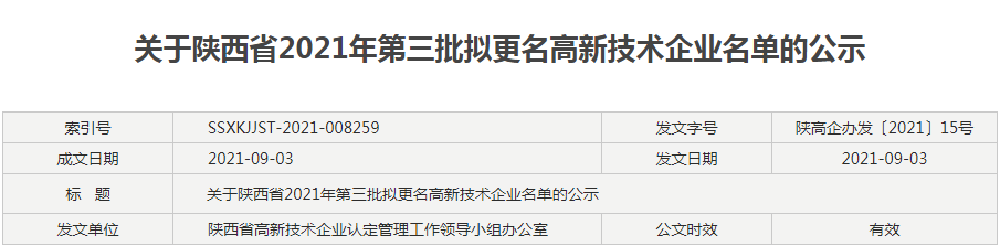 根据《高新技术企业认定管理办法》(国科发火〔2016〕32号)、、、、《高新技术企业认定管理工作指引》(国科发火〔2016〕195号)有关规定,,,经企业申请,,,,省高新技术企业认定管理工作领导小组办公室审核,,,现将陕西省2021年第三批31家拟更名高新技术企业名单予以公示,,公示期为10个工作日。。