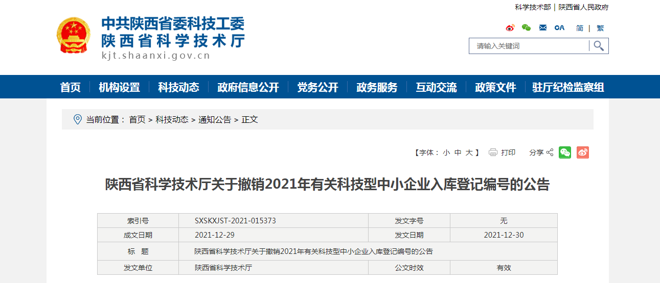 陕西省科学技术厅关于撤销2021年有关科技型中小企业入库登记编号的公告